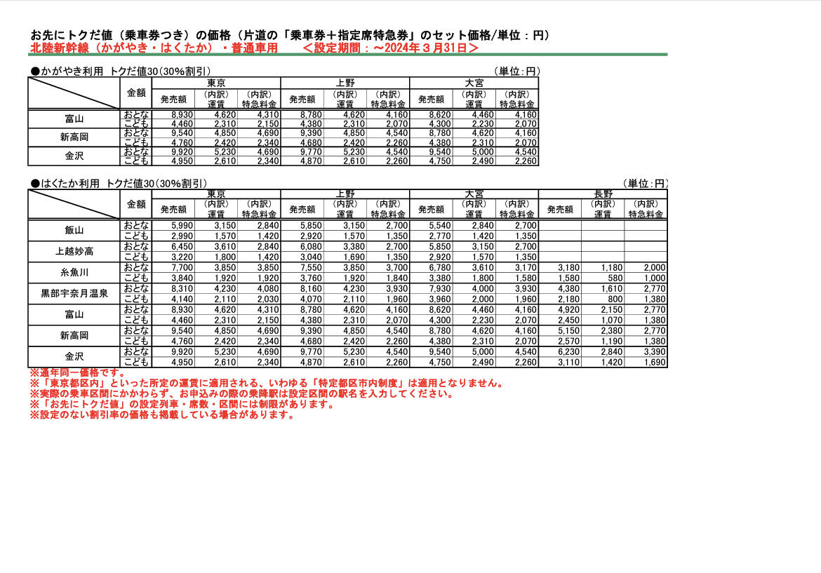 設定区間:「かがやき」東京・上野・大宮⇔富山・新高岡・金沢 / 「はくたか」東京・上野・大宮⇔飯山~金沢間の各停車駅、長野⇔糸魚川~金沢間の各停車駅