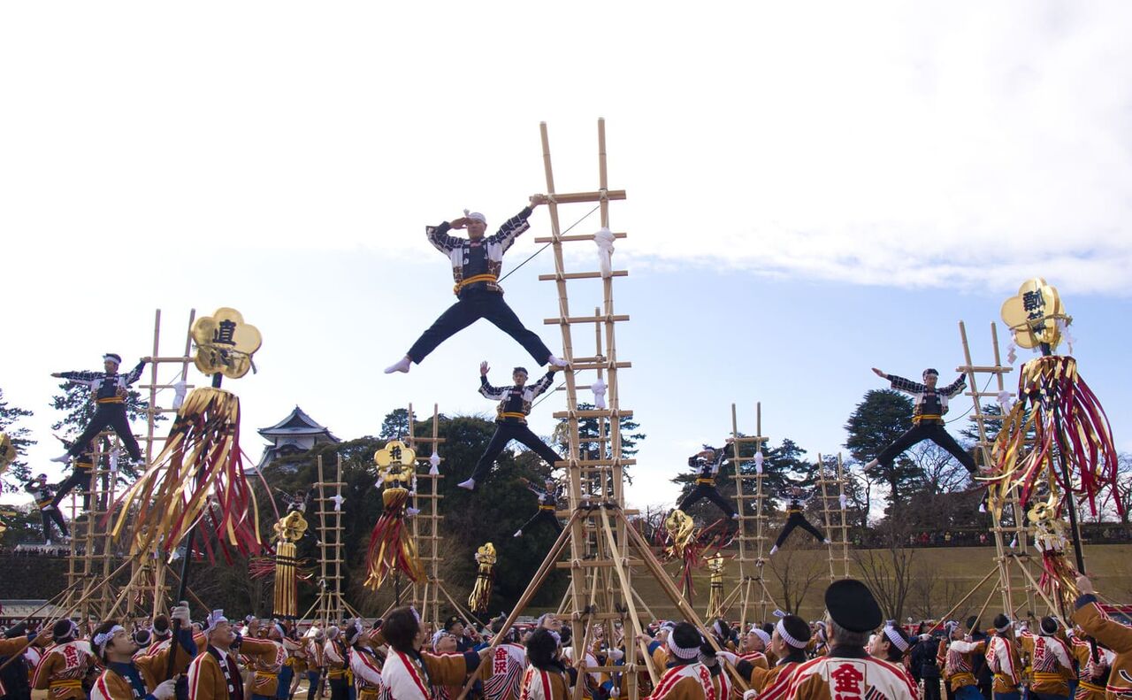 勇壮な「加賀鳶梯子登り」と