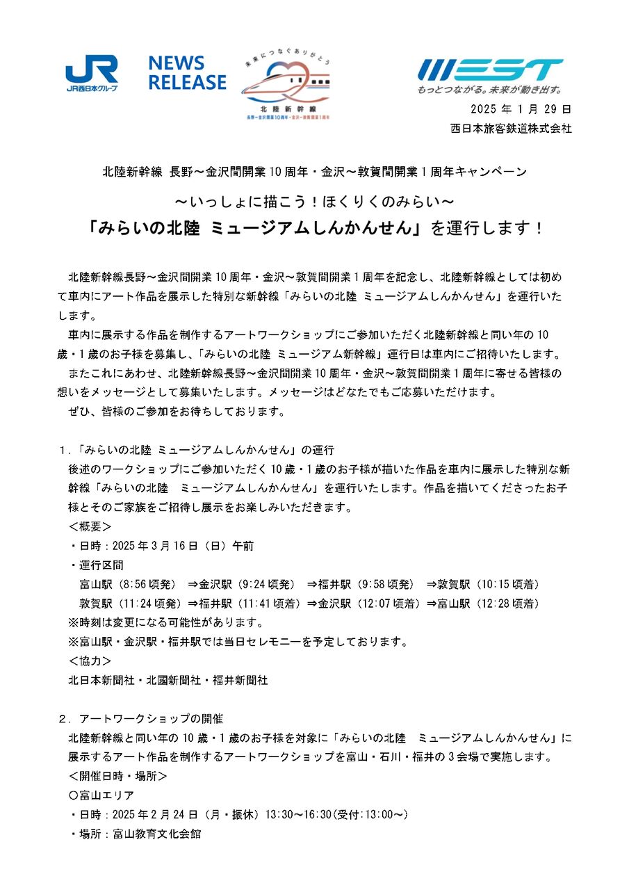 応募方法:①【JR 西日本公式 X アカウント】(@jrw_snscp)をフォロー。②X で「#北陸新幹線 10周年・1周年」のハッシュタグを付けて、応募期間内にメッセージやイラストを投稿。③当選者には公式Xアカウントからダイレクトメールが届く。