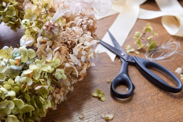 ドライフラワーや能登ヒバのリボンでつくる