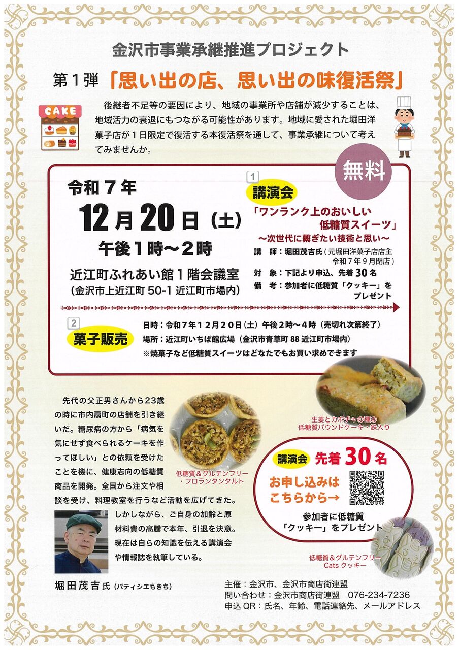 時 間:講演会(13:00~14:00)、菓子販売(14:00~16:00)※売り切れ次第終了
