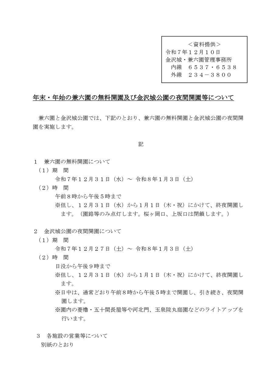 『兼六園』『金沢城公園』は終夜開園。